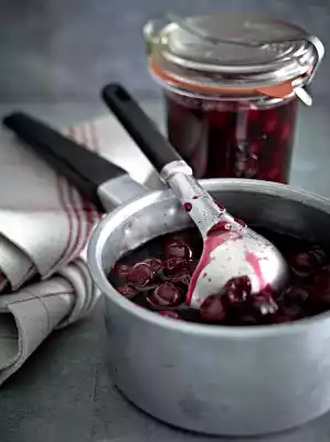In the meantime, put the cherries into clean glasses. Pour the hot infusion over them, leaving about 1.5 cm free towards the rim. Close the jar.