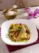 Add 35 g of fat in flakes and coriander and toss. Fill the fricassee into a terrine, garnish with the remaining chilli pepper and sprinkle with coriander. Add rice.