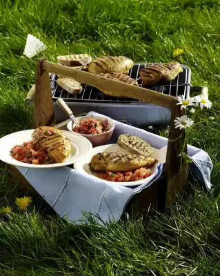 Wash lemon balm, dab dry, remove coarse stalks. Cut lemon balm into strips. Mix melon, onion, lemon balm, 3 tablespoons olive oil and lemon peel. Season to taste with lemon juice, a little salt, pepper and sugar. Remove the meat from the marinade and drain briefly. Fry meat on the hot grill, turning, for about 14 minutes. Arrange meat and melon relish on plates. Roasted wholemeal baguette tastes good with it