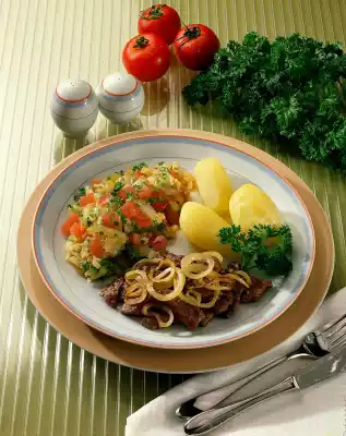 Peel the remaining onions and cut into rings. Heat the remaining oil in a coated pan and fry the fillet strips with the onion rings for about 5 minutes and season with salt and pepper. Heat the Chinese cabbage, season with soy sauce and add the diced tomatoes.