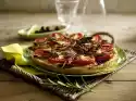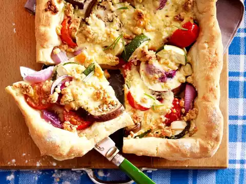 Warm up the milk. Dissolve yeast in it. Knead the yeast mixture with 250 g flour, 1 teaspoon sugar, 3 tablespoons olive oil and 1 pinch of salt to a smooth dough. Cover and leave to rise in a warm place for about 30 minutes until it has doubled in volume. Clean and wash the zucchini and aubergine, cut them in half lengthwise and slice them. Peel and slice onions and garlic.