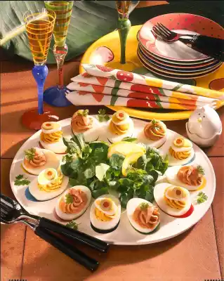 Possibly cut quail eggs into slices. Cut chicken eggs in half lengthwise, remove the egg yolk. Mix 5-6 egg yolks and mustard
