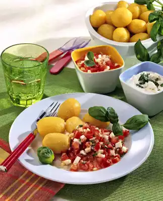 Hard boil eggs. Wash the tomatoes. Peel onions and eggs. Dice the whole thing and 50 g feta. Mix with parsley, oil and vinegar and season to taste. Boiled potatoes go well with it