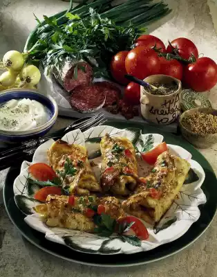 Wrap the sides and roll up the crepes. Place in an ovenproof dish with the open side facing down. Mix sour cream, egg yolk, grated cheese and a little pepper. Spread over the crêpes and sprinkle with the remaining diced tomatoes and spring onions.