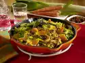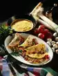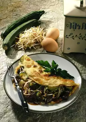 Whisk flour, mineral water, egg and 1 pinch of salt to a smooth pancake batter and let it swell. Wash and clean the zucchini and cut into thin slices. Wash, sort and drain the bean sprouts. Clean and wash the liver, dab dry with kitchen paper and cut into strips. Heat 1 tablespoon of oil in a non-stick frying pan and fry the liver briefly, turning it over. Season with salt and pepper and remove. Fry the zucchini and sprouts in the hot oil, turning them over. Deglaze with 3 tablespoons of water and 1-2 tablespoons of soy sauce. Steam for about 3 minutes. Thicken liquid with sauce thickener. Add roasted liver and let it simmer at low heat. Heat the remaining oil and bake a pancake in it until golden brown. Slide onto a plate, place the vegetable-liver stuffing on one half, fold over the other half and garnish with parsley