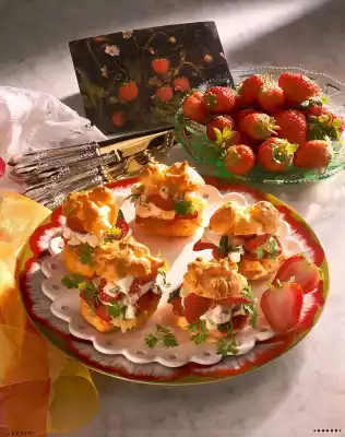 Let the dough rest for about 20 minutes. With a spoon, place 12 heaps on a baking tray lined with baking paper and bake in a preheated oven (electric cooker: 200°C/ gas: level 3) for 35-40 minutes. (Do not open the oven in between). Clean and wash spring onion and cut into fine rings. Cook spring onion in boiling salted water for 1 minute, pour onto a sieve and drain. Cut cheese into small cubes. Wash the chervil, dab dry and pluck the leaves from the stalk. Wash, clean and slice the strawberries. Cut the doughnuts while still hot with scissors and place them on a grid to cool. Mix strawberries, chervil, spring onions and cheese.