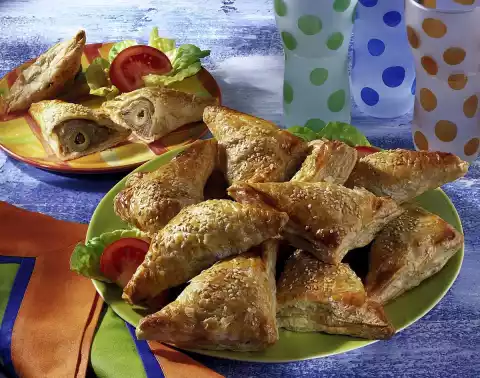 Push one olive into the mince. Separate the remaining egg. Spread the edges of the dough with egg white. Fold the puff pastry into triangles and press the edges together. Stir egg yolk and 2 tablespoons of water until smooth.