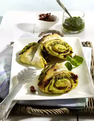 Heat 250 ml water. Put the flour in a bowl, make a depression in the middle and crumble the yeast into it. Add 1 pinch of sugar and 100 ml lukewarm water and mix with some flour from the edge to a thick paste. Cover and leave to rise for 15-20 minutes. Add the oil, remaining water and salt to the pre-dough in the bowl and knead into a smooth yeast dough with the dough hooks of the hand mixer. Cover the dough and let it rise again for about 40 minutes. Cut the tomatoes into strips. Roll out the yeast dough on a floured work surface to a rectangle (50 x 35 cm). Spread the dough with pesto and sprinkle with tomato strips. Roll up the yeast dough firmly from the long side. Cut the roll trapezoidally into 3-4 cm wide slices and press them in lengthwise with the handle of a wooden spoon. Put the French rolls on 2 baking trays lined with baking paper and let them rise for another 20-30 minutes. Bake in the preheated oven (electric cooker: 225 °C/ convection oven: 200 °C/ gas: level 4) for about 10 minutes in succession. Let them cool down
