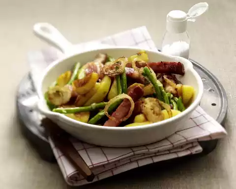 Drain the potatoes, rinse under cold water, drain and remove the skin. Halve the potatoes and cut into slices. Cut the meat into strips. Melt butter and fry onion cubes until translucent while turning.