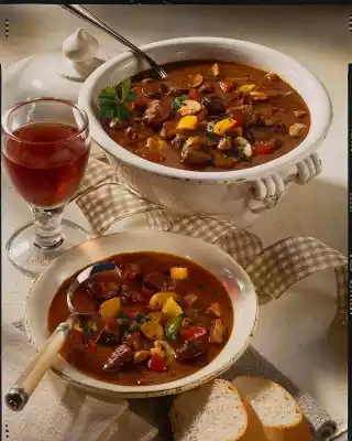 Peel and roughly dice the onion. Clean, wash and dice the peppers. Clean the mushrooms and cut into slices as desired. Wash goulash and pat dry with kitchen paper. Cut meat cubes into smaller pieces as desired. Heat the oil in a large pot and fry the meat thoroughly, turning it over. Add onions, mushrooms and paprika and fry briefly while turning.