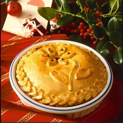 Mix everything with bacon and minced beefsteak. Add egg, Madeira, cream and green pepper. Wash parsley, chop finely, add to the meat dough and mix in. Season to taste with salt and pepper. Roll out the pâté dough thinly. Cut out a round plate (approx. 22 cm Ø) and place it in a pâté dish (approx. 16 cm Ø). Press the rim firmly. Fill in the meat dough and smooth it down. Now cut out a second plate (approx. 16 cm Ø) and coat the edge with egg yolk. Put the lid on the pâté and press it down well. For decoration cut out small leaves, slightly larger petals, two petals and a stem.