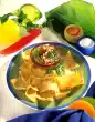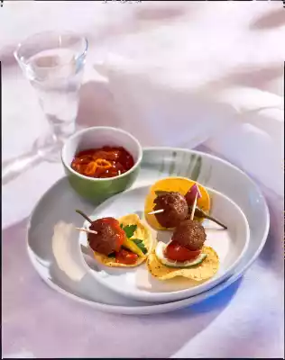 Peel and halve the onion and cut one half into large cubes. Finely dice the remaining onion and mix with the seasoning sauce. Drain the pepperoni. Skewer meatballs, lime slices, alternating red and green peppers and coarse diced onion onto the tortilla chips with a wooden skewer.