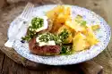 Melt the clarified butter. Cut the potatoes into thick slices and mix them with rosemary, lard and about 1 teaspoon sea salt. Distribute on a baking tray. Bake in a hot oven for 30-35 minutes.
