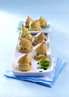 Stir in 2 eggs one after the other. Pour the dough into a piping bag with perforated spout and spray walnut-sized tuffs onto 2 baking trays lined with baking paper. Bake one after the other in a preheated oven (electric cooker: 200 °C/ convection oven: 175 °C/ gas: level 3) for about 15 minutes. Do not open the oven door. Halve the cream puffs horizontally while still hot. Let it cool down. Crumble the gorgonzola, mix with cream cheese and milk until smooth. Drain and chop the tomatoes. Wash basil, dab dry, put some leaves aside for garnishing. Chop the remaining leaves and fold into the cheese mixture with the tomatoes.