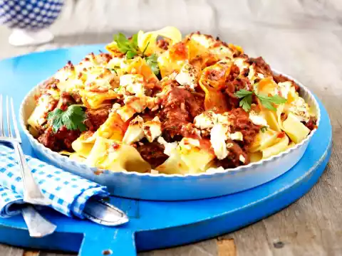 Stir the parsley into the sauce. Drain the pasta and rinse briefly with cold water. Layer together with the minced sauce in a tart dish (without lift-off base) or an oven dish. Crumble the cheese and sprinkle over the noodles.