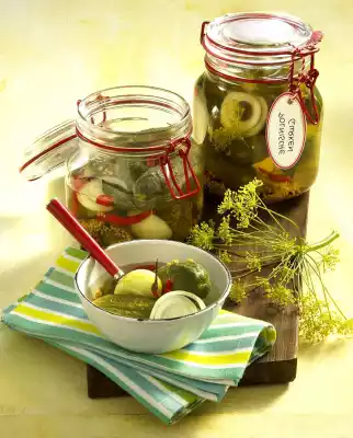 Pour the boiling hot stock over the cucumbers immediately, so that everything is well covered. Close the glasses. Store in a cool place for about 2 weeks. Then drain the stock, bring to the boil again and pour over the cucumbers again. Close the glasses again. Let the cucumbers steep in the stock for 4-6 weeks. Shelf life 9-12 months