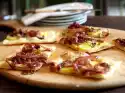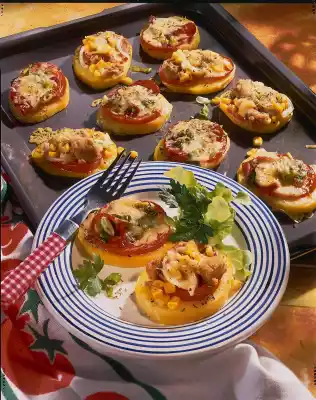 Together with a slice of salami, spread on half of the potato slices. Drain tuna and corn separately. Peel onion and cut into fine rings. Spread on the remaining potato slices together with tuna and corn.