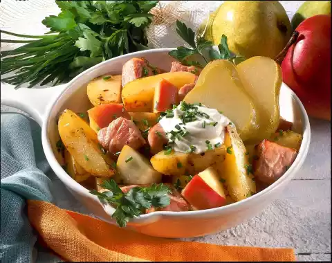 Peel and finely chop the onion. Peel potatoes, wash and quarter them lengthwise. Wash, core and dice apple and pear. Cut the smoked pork into cubes. Wash chives and cut into fine rolls.
