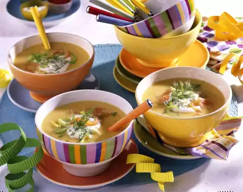 Cut salmon into strips. Wash the dill and cut finely. Puree soup and add leek. Season to taste with salt, pepper and cayenne pepper. Arrange potato soup with crème fraîche, salmon and dill in bowls.