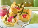 Place 2 puff pastry slices on top of each other and roll out square (approx. 18 x 18 cm) on a floured work surface. Cut each into quarters. Fold the dough corners of the 8 squares about halfway inwards and press firmly. Spread the crème fraîche on the dough. Cover with onions, capers and tuna