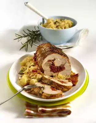 Remove the roast and keep it warm. Stir the starch with a little water until smooth. Thicken the stew with it. Season sauce with salt and pepper. Season sauerkraut with salt and pepper. Arrange everything.