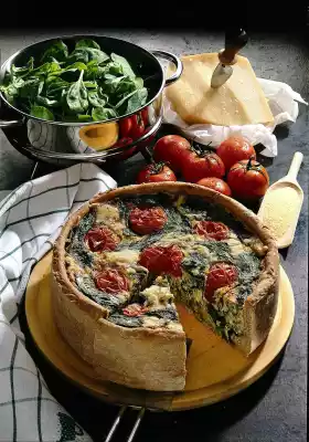 Line the floor with it. Form the remaining dough into a roll, place it on the edge of the springform pan and press it up to a rim with your fingers. Add the spinach. Pour over the vegetables. Clean and wash the tomatoes and press them into the mixture.