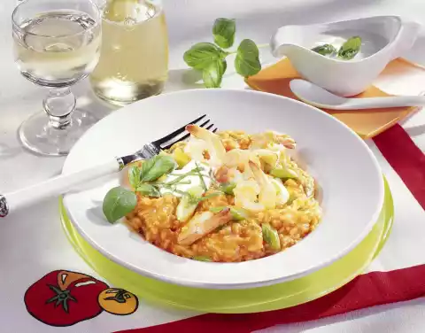 Arrange tomato rice with scampi on plates, add a dash of yoghurt sauce and garnish with basil.