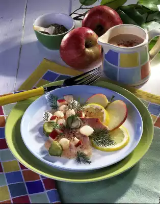 Mix salad cream, ketchup and orange juice until smooth. Season with salt, pepper and paprika. Wash the dill, pluck the flag from the stalks. Arrange cocktail on plates. Spread some sauce over them. Sprinkle dill on top. Garnish the cocktail with slices of lemon and apple. Add the rest of the sauce.