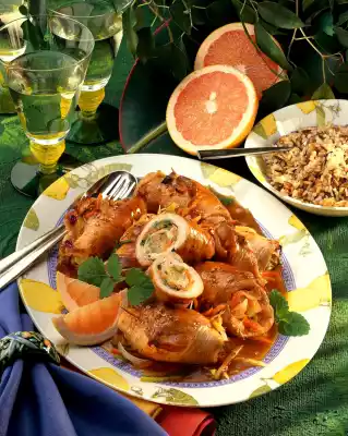 Clean and wash the carrots and leek and cut them into fine strips (julienne). Heat the fat in a pot and steam the vegetables for 2-3 minutes. Season with salt and pepper and let it cool down. Peel grapefruits so that the white skin is completely removed. Remove the fillets with a sharp knife between the parting skins. Squeeze the parting skins and collect the juice. If necessary, beat the cutlets a little flatter on a large kitchen board and season with salt, pepper and corn together. Spread 2/3 to 1/2 of the vegetables on the cutlets. Place 2-3 grapefruit fillets on one end of each cutlet and roll up with the vegetables. Pin with roulade or wooden skewers. Heat the oil in a roasting pan and fry the roulades vigorously all around. Season with salt and pepper and deglaze with chicken stock. Add remaining vegetables and braise covered for about 15 minutes. Meanwhile bring vegetable stock to the boil in a pot, add 7 Corn-Equilinia and cook covered for 20-30 minutes. Remove the roulades from the braising stock and keep warm on a deep plate. Pour cream into the stock, add sauce thickener and bring to the boil again briefly while stirring. Season to taste with grapefruit juice, salt and pepper. Pour sauce over the roulades and sprinkle with crushed coriander as desired. Serve garnished with grapefruit wedges and lemon balm. Add 7-Corn-Equilinia extra