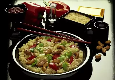 Heat the remaining fat in a frying pan. Brown the meat in it. Add pieces of paprika and leek and cook everything in the closed pan for 10-12 minutes. Add meat and vegetables to the rice and mix in.