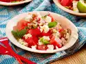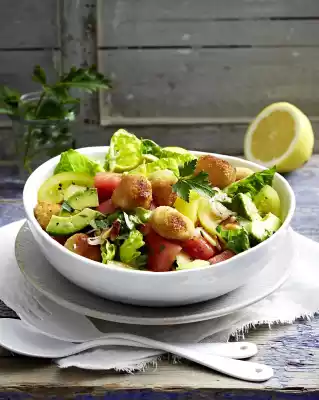 Roast pine nuts in a pan without fat until golden brown. Let them cool down on a flat plate. Cut melon into slices, remove skin. Cut the flesh into cubes of about 1.5 cm. Wash, dry and halve the tomatoes and remove the stalk. Cut tomato halves into slices. Clean, wash, dab dry and cut lettuce into large pieces. Halve avocado, remove seeds. Remove the flesh from the skin, cut into slices