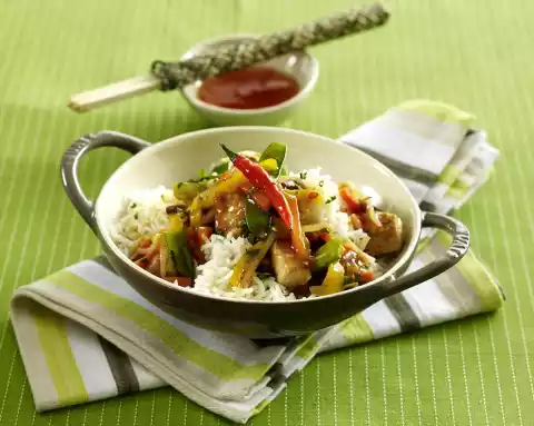 Heat 1 tablespoon of oil in a frying pan. Fry the diced turkey and chilli pepper for about 5 minutes, turning them over. Season with salt and pepper and remove from the pan. Add 2 tbsp. oil to the pan and heat. Fry the frozen vegetables and garlic for 3-4 minutes.