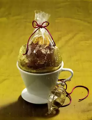 Pour coffee and tea alternately into the bag and garnish with star anise and orange peel. Use a normal amount of coffee to brew (approx. 1 coffee spoon per 2 cups), mixing coffee and tea