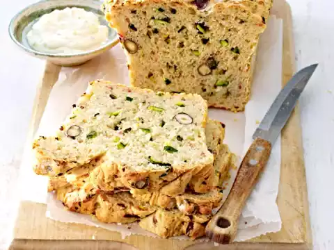 Knead yeast water, flour, salt, thyme, nuts, zucchini, cheese and ham with the dough hooks of the hand mixer to a smooth dough. Cover the dough and leave to rise in a warm place for about 45 minutes. Knead the dough again and fill it into a greased and floured box form (1.8 litres; bottom 8 x 27 cm). Let it rise again for about 45 minutes.