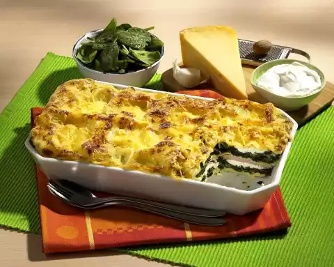 Repeat the whole process (sauce, spinach, ricotta cheese, lasagne sheets). Pour the rest of the sauce onto the last layer of lasagne sheets. Grate the cheese and sprinkle over the lasagne. Bake in the preheated oven (electric cooker: 200 °C/ convection oven: 175 °C/ gas: level 3) for approx. 30 minutes until golden brown.