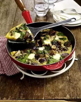 Heat the oil in a pan (22 cm Ø). Fry the mushrooms for about 4 minutes. Add spinach. Pour egg-cream over it and let it simmer at low heat for 7-8 minutes