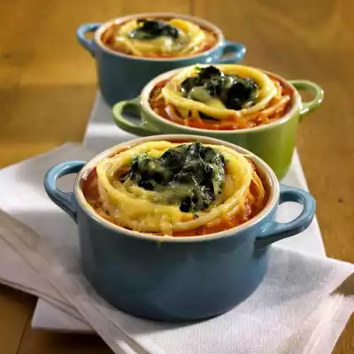 Bring sauce to the boil and thicken with sauce thickener. Drain the noodles. Lightly grease 4 ramekins (approx. 250 ml) and fill in the pasta in a nest. Fill spinach in the middle, tomato sauce on the edge. Grate cheese and sprinkle over pasta and spinach. Bake in a preheated oven (electric cooker: 200 °C/ convection oven: 175 °C/ gas mark 3) for about 15 minutes