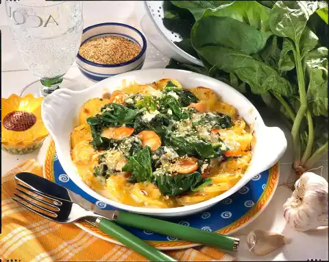 Let the spinach collapse and steam covered for about 1 minute. Season with salt and pepper. Put potatoes, spinach and carrots in a small gratin dish. Mix sour cream, egg, some salt, pepper and nutmeg. Pour over the vegetables and sprinkle with cheese and sesame seeds. Bake in the preheated oven (electric cooker: 200 °C/ gas: level 3) for 25-30 minutes