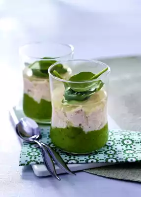 Pour the spinach puree into 4 glasses. Put the salmon cream on top and finish with lemon jelly. Put the glasses in a cool place for about 1 hour until the jelly is firm. Garnish with spinach leaves before serving