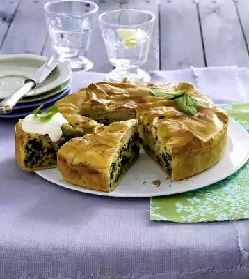 Fill in the spinach mixture. Fold over the excess dough towards the middle and press down well. Bake the cake in the preheated oven (electric oven: 200 °C/circulating air: 175 °C/gas: level 3) for approx. 50 minutes. Whisk the egg yolks and 2 tbsp. water.