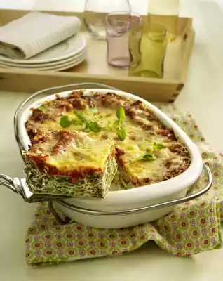 Add the cream cheese and stir until the cream cheese is smooth and creamy. Add the spinach and season to taste with salt, pepper and nutmeg. Heat 1 tablespoon of oil in a saucepan, fry the rest of the onions and garlic. Add tomato paste and herbs, sauté briefly. Deglaze with strained tomatoes. Let simmer for about 5 minutes. Season to taste with salt, pepper and paprika. Grease the casserole dish. Put 1/4 of the pasta plates into the dish. Spread 1/3 of the cream cheese on top. Cover with another 1/4 of the pasta plates. Layer pasta plates and cream cheese, finish with pasta plates.