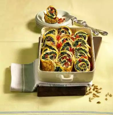 Place the pancakes side by side and spread with cream cheese. Spread spinach and feta cheese on top. Sprinkle with pine nuts. Roll up the pancakes and cut into pieces. Put them in a greased casserole dish and sprinkle with Parmesan cheese.