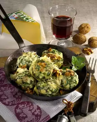 Form 8 spinach dumplings from the mixture and cook in plenty of boiling salted water for 10-12 minutes. Lift out with a skimmer and drain. Coarsely chop the nuts. Melt 75 g butter in a pan and roast the nuts in it. Swivel spinach dumplings in the hot butter. Sprinkle with cheese set aside, garnish with oregano and serve immediately