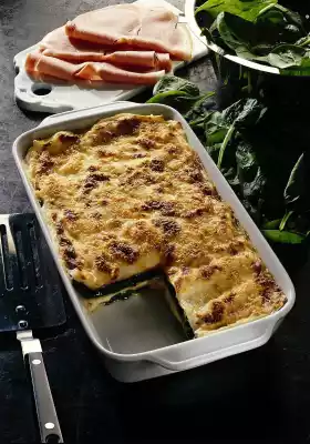 Cut the ham into strips. Layer the ingredients in a greased ovenproof dish. Pour sauce over each layer. Bake in the preheated oven (electric oven: 200 °C/ gas: level 3) for about 30 minutes.