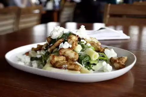 Cook the pasta in boiling salted water according to the instructions on the packet. Heat the oil in a pan. Fry the chicken for 2-3 minutes. Season with salt and pepper.