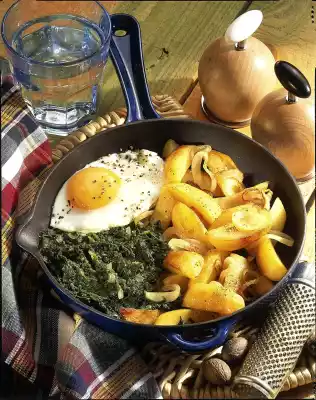 Season the potatoes with salt and pepper and push them together in the pan. Heat the remaining oil in the pan, break the egg and fry in the pan, sprinkle with salt and pepper. Sprinkle spinach with nutmeg and push together a little.