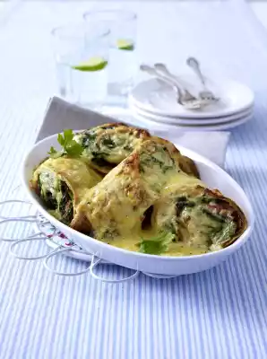 Spread the spinach and ham on the pancakes and roll them up. Cut the pancakes in half and place them in an ovenproof dish, preferably with the seam side down. Pour cheese sauce over them and sprinkle with Gouda.
