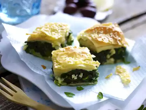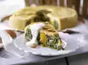 Preheat oven (electric cooker: 175°C/circulating air: 150°C/gas: level 2). Pour the spinach mixture into the mould, place the excess dough over the spinach. Place the rest of the dough sheets on top, brushing each with butter.