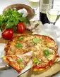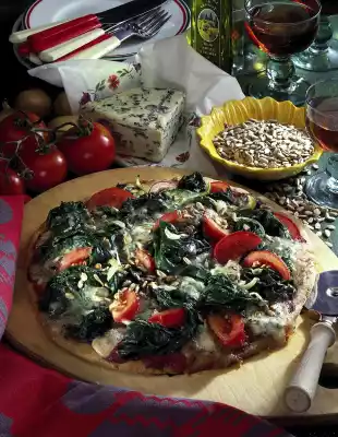 Mix yeast in 4-6 tablespoons of lukewarm water. Knead flour, yeast, 3 tablespoons of oil and salt. Leave in a warm place for about 20 minutes. Peel onions and garlic. Cut the onions into slices and crush the garlic. Heat 2 tablespoons of oil. Defrost the spinach in a little water at medium heat for about 12 minutes. Season with salt and pepper. Clean, wash and cut the tomatoes into eighths. Dice cheese. Roll out the dough into a circle (30 cm Ø) on a lightly floured work surface. Spread with strained tomatoes. Spread drained spinach, tomatoes and cheese on top. Sprinkle with sunflower seeds. Bake the pizza in a preheated oven (electric cooker: 200 °C/ gas: level 3) for approx. 25 minutes