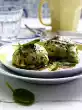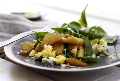 Cut the gorgonzola into small pieces. Wash the spinach and spin dry. Fold the spinach with the two cheeses and 1 tablespoon butter into the hot polenta. Season to taste with salt, pepper and nutmeg. Arrange the polenta on plates with the pears and caramel stock.
